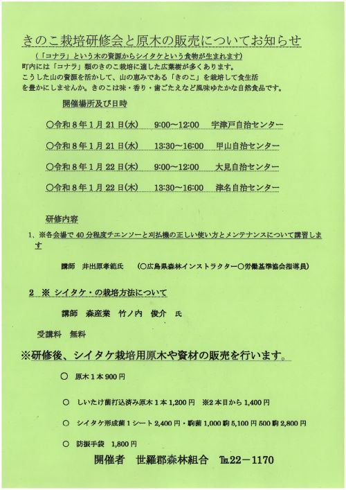 令和8年1月21日(水)、1月22日(木)に、「きのこ栽培研修会」を開催します。
