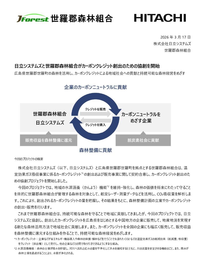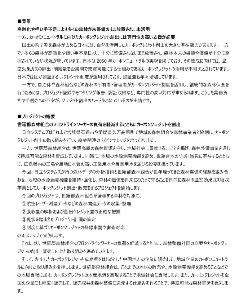 世羅郡森林組合では、株式会社日立システムズと協力し、私たちが管理する森林を活かしたカーボンクレジット創出プロジェクトをスタートしました。